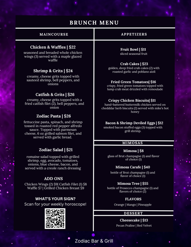 Juicy 16 oz. grilled steak seared to perfection, served with fluffy scrambled eggs and a side of seasoned breakfast potatoes. A hearty, classic brunch built to satisfy.