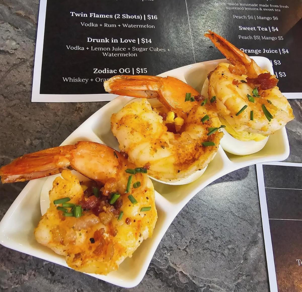Smoked bacon stuffed eggs (3) topped with grill shrimp.